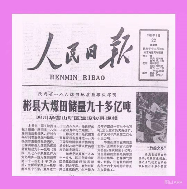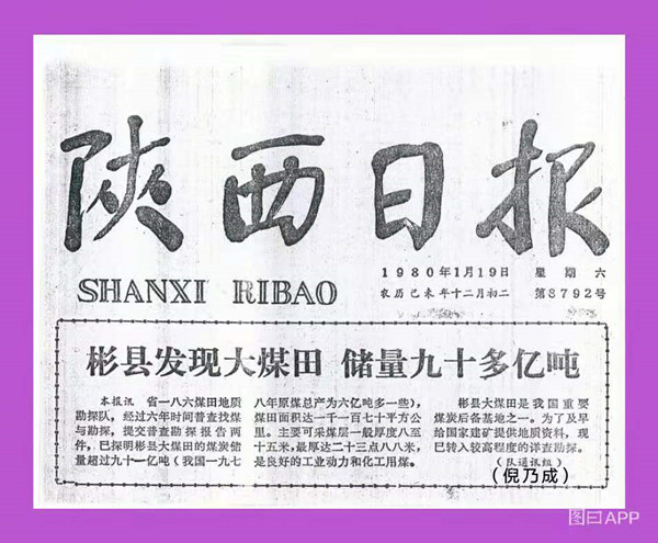 1980年1月22日,《人民日报》头版头条刊登《陕西省一八六煤田地质勘探队探明彬县大煤田储量九十多亿吨》的新闻:“陕西省一八六煤田地质勘探队,经过六年时间普查找煤与勘探,提交普查勘探报告两件,已探明彬县大煤田的煤炭储量超过九十一亿吨(我国一九七八年原煤总产为六亿吨多一些),煤田面积达一千一百七十平方公里。主要可采煤层一般厚度八至十五米,最厚达二三点八八米,是良好的工业动力和化工用煤。彬县大煤田是我国重要煤炭后备基地之一。为了及早给国家建矿提供地质资料,现已转入较高程度的详查勘探。”