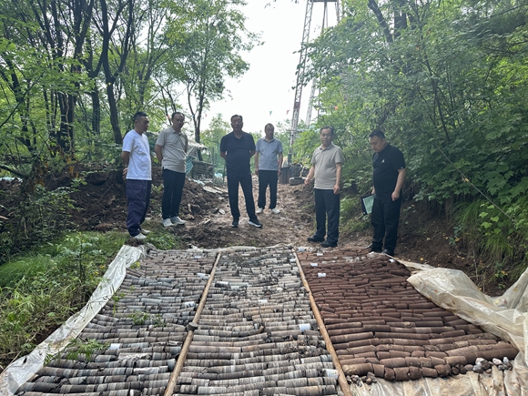 胡同计一行在钻机施工现场检查过程中,王军、吴修嵘分别汇报了井场修路、钻机工艺、项目进度、安全环保、岩芯采取以及地质构造等情况,胡同计与项目组就施工过程中的要点和难点进行了交流讨论。