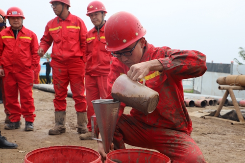 活动现场,来自TSJ2600和TXJ1600钻机的27名一线职工神采焕发,分4个班组进行竞赛,活动分为理论答题和实操竞赛两个阶段进行。理论测评涵盖钻探工艺、设备使用、保养维护、安全生产、数据计算等内容,参赛职工沉着冷静答题,赛出各自的风格和水平。实操比赛分为钻探上下钻和泥浆性能测试两项,以班组为单位进行,上下钻项目工序多且时间紧,只见职工们争分斗秒地安全操作,挂钻杆、对丝扣、接钻杆、对立轴、操控猫头轮、下钻、提钻等各环节配合紧密有序;在泥浆性能测试竞赛项目中,各班组泥浆工凭借各自丰富的工作经验测量泥浆比重、粘度、PH值、清洁操作台等,每个环节操作都格外细心,整个竞赛现场严肃紧张且精彩纷呈。