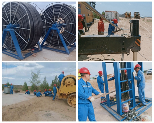 现场项目组进场后,首先构筑混凝土基础、预设预埋件,安装井口架、电缆支架、吊车辅助。将矿方采购的电缆倒盘。因电缆盘定制尺寸有限,且电缆线径78mm,为了防止电缆在倒盘过程中产生扭劲而出现断丝,无法用常规机械辅助倒盘,只能人工缓慢匀速操作释放扭转应力。考虑施工现场自然环境影响,厂长胡彦军即刻调整了作业人员的工作时间,每日清晨6点开始工作,下班时间根据现场工作进度与矿方要求决定。从7月4日至6日,历经三天,现场作业人员与沙漠里40℃气温一样“热情高涨”,2盘共计1800米约25吨的电缆全部倒盘完成。