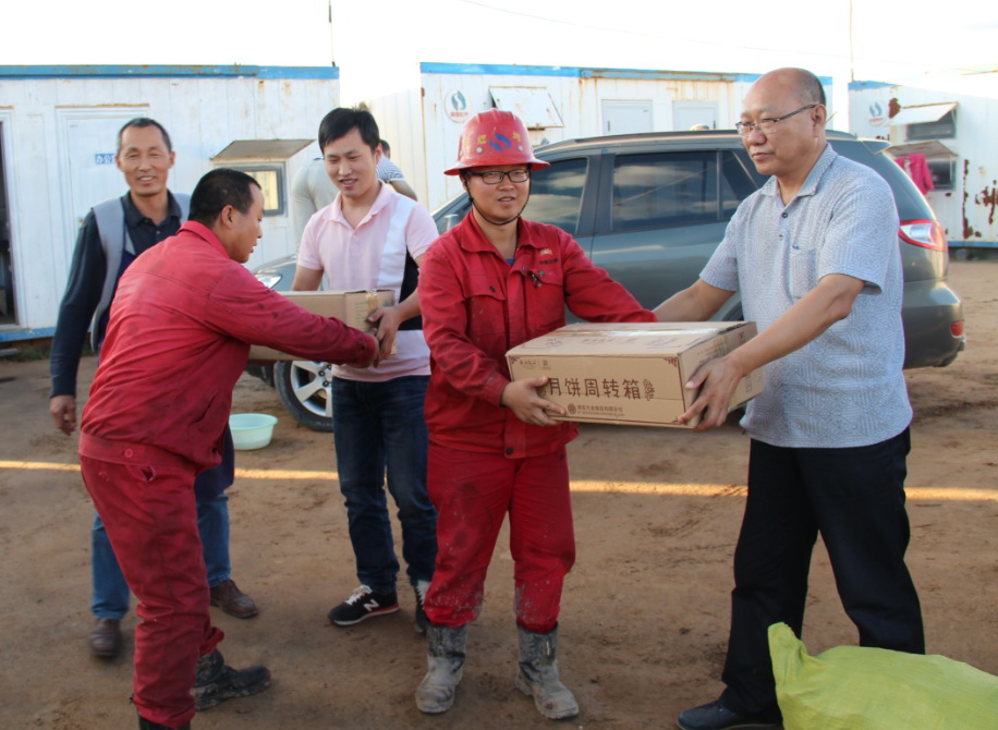 9月8日,姬总一行6人来到40186井队施工现场,给井队职工带去了蔬菜、月饼、水果等慰问品。姬总和