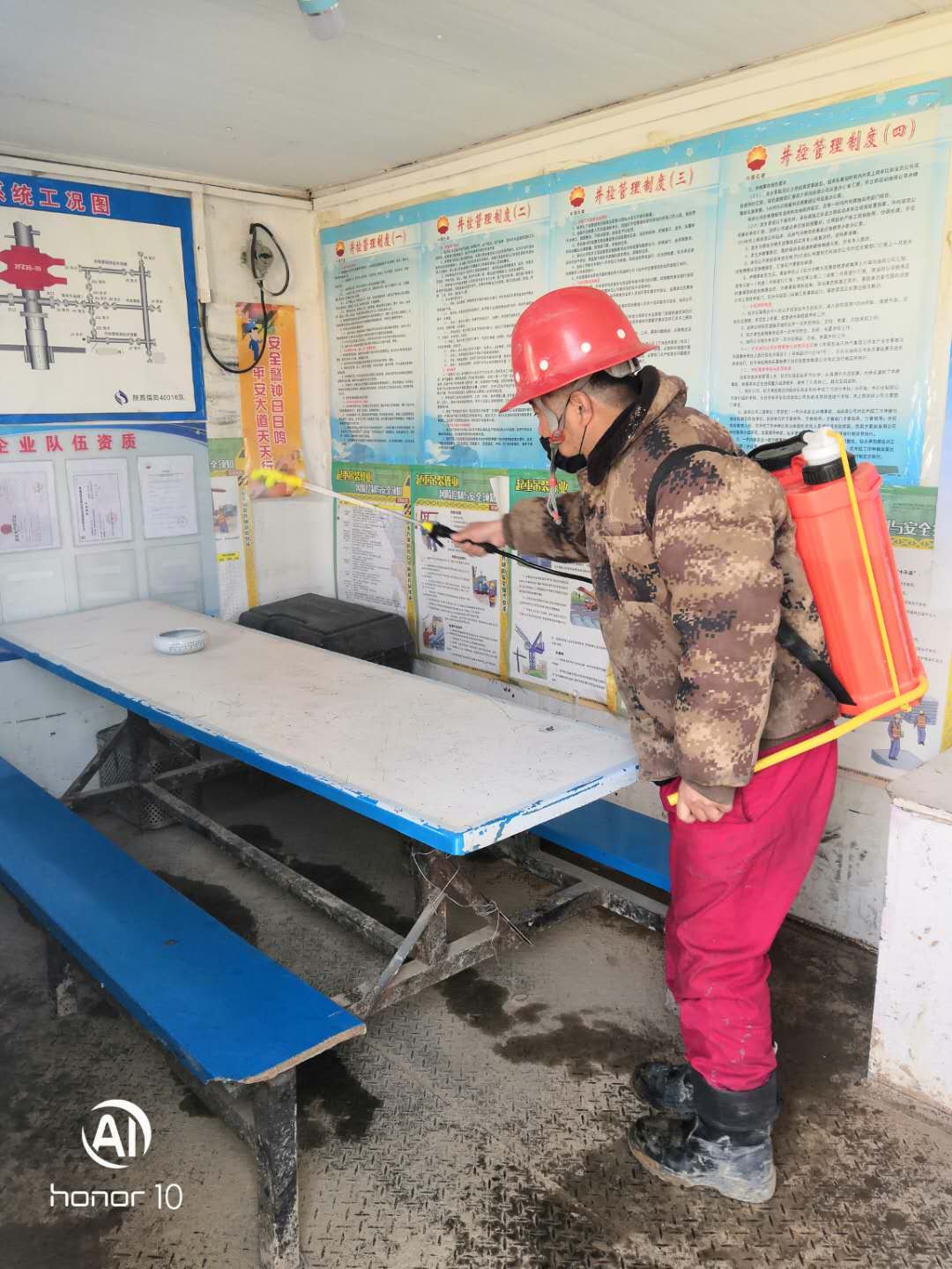 施工地甘肃省疫情防控应急响应级别虽然由一级调整为三级响应;但他们丝毫没有对疫情防控意识的放松;做到“两手抓”即一手抓复工复产,一手抓疫情防控;严格按照启动方案制定的措施去执行,在人员方面:不但要求复工返岗人员,必须持所在居住地的村委会(小区)开具隔离证明、健康证明,还要在当地疫情防控中心认可的医院为每个人员做身体体检,保证进入井场的每个人员身体健康,无咳嗽、发热症状,并做好防范检测隔离工作,在没有完全消除疫情之前,绝不放松警惕;在复工复产方面:通过多种方式采购疫情防控物资;如:一次性口罩、84消毒液、酒精、体温测量仪等。坚持每日多次对施工现场、生活区域进行消毒工作。