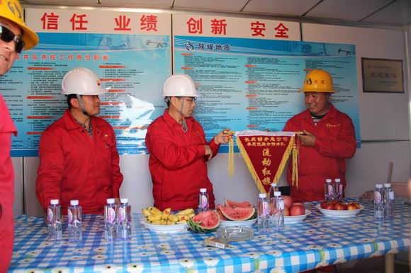 近日,长庆钻井总公司在第一季度对合作代管钻井队从安全生产、规范化管理、钻井效率、钻井质量等方面进行综合考评,陕西煤田地质油气钻采有限公司50008井队以绝对优势从23个井队中脱颖而出,获得第一名,被长庆钻井总公司授予“季度优胜合作井队” 荣誉称号。2013年5月20日,川庆钻探第五工程项目部领导来到50008井队,为井队颁发流动红旗,并带来慰问品以示鼓励。