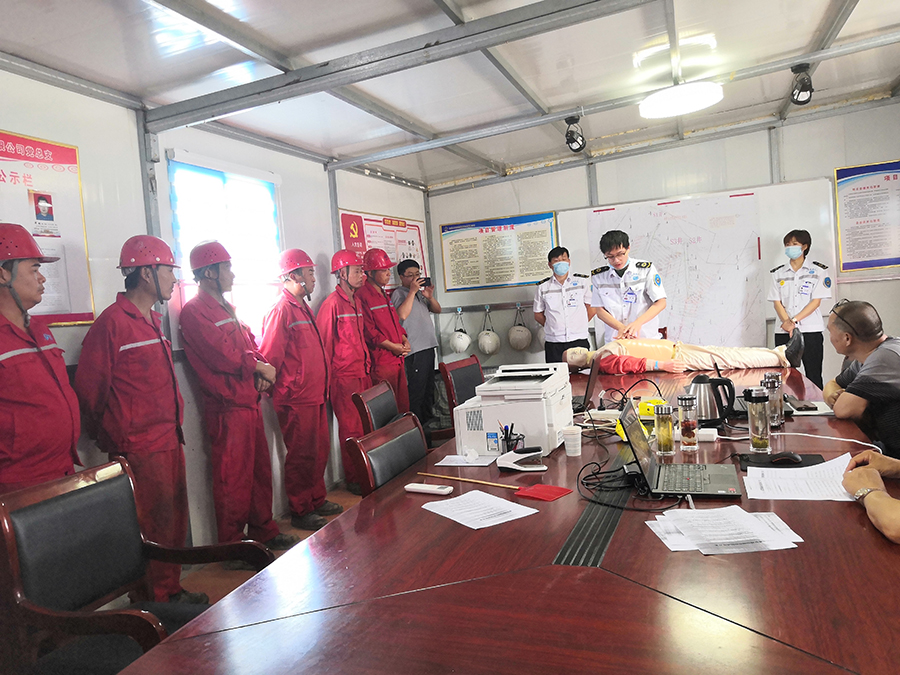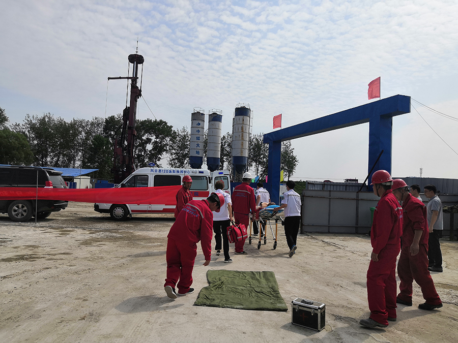 在演习开始前,先由凤台县应急救援中心的同志为井队人员演示了心肺复苏的具体操作步骤,并根据当前气候情况讲解了如何对中暑情况作出应急救援,由井队人员进行实际操作,并详细指出了其中的不足。经过老师的讲解,大家对于心肺复苏有了深入的了解并掌握了心肺复苏的应急救援方法。随后井队抽出专人进行应急演练,由井队人员模拟触电受伤人员,大家做出应急反应,抬担架、打电话、心肺复苏,一切程序有条不紊的进行,紧张而不显慌乱,随着救护车到达现场,受伤人员得到了有效的救治,防止了事态的恶化,最后由应急救援中心的同志对大家的应急反应做出评价,总体考核结果优秀。.jpg)
