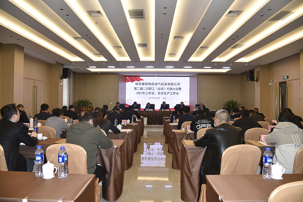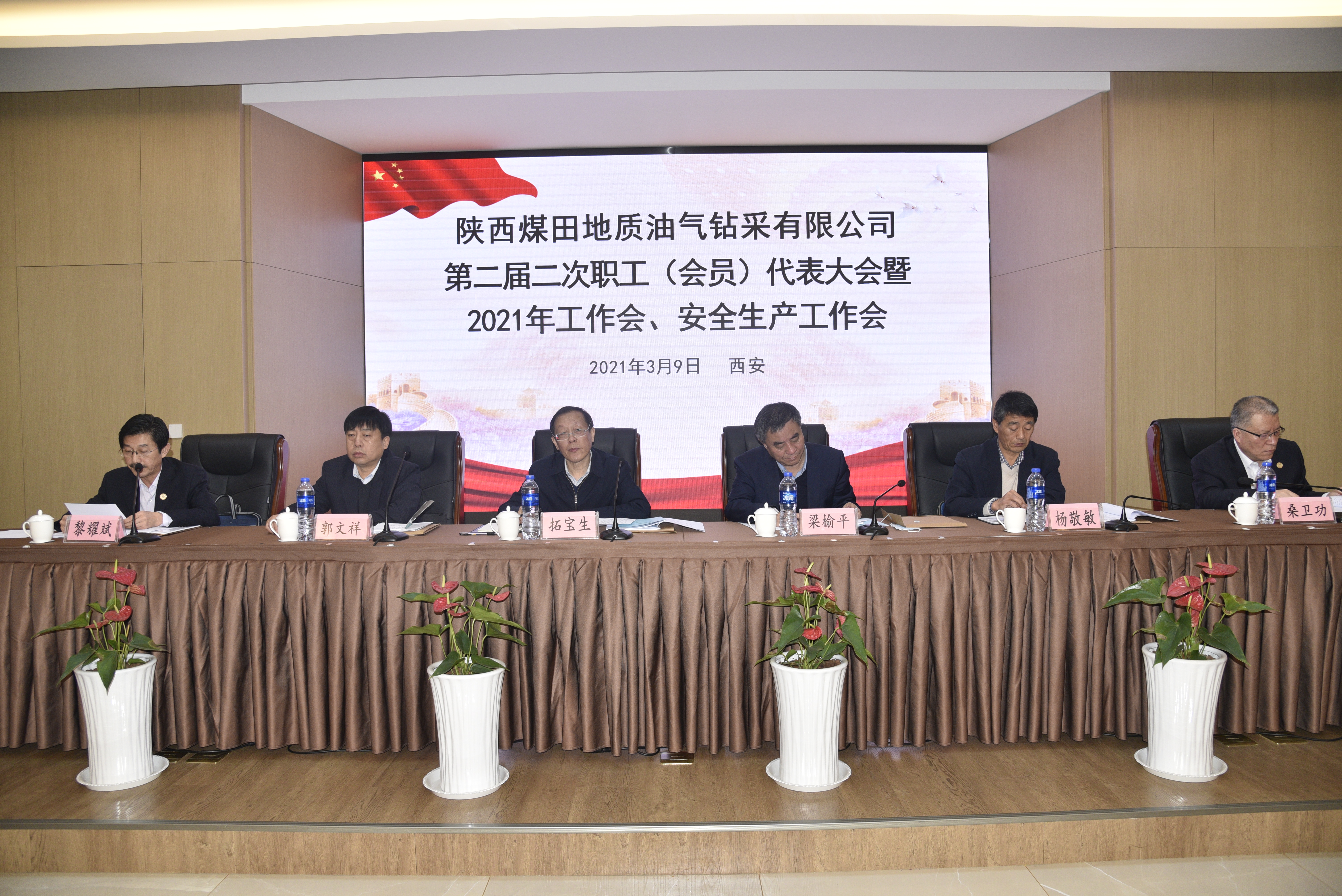 3月9日,煤田地质油气钻采有限公司召开了二届二次职工(会员)代表大会暨2021年工作会、安全生产会议,公司领导班子、中层干部和职工(会员)代表共计50余人参加了本次大会。陕煤地质集团公司党委副书记梁榆平、陕煤地质工会主席杨敬敏、集团党委工作部组织处副处长拓宝生莅临大会指导,梁榆平代表集团公司作了重要讲话。.jpg)