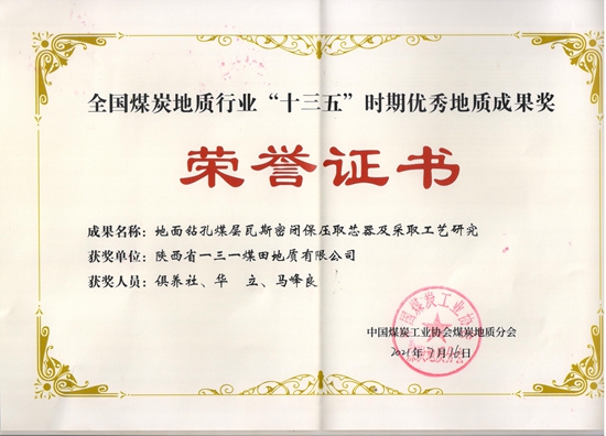 7月份,由公司俱养社、华立、马峰良研制的《地面钻孔煤层瓦斯密闭保压取芯器及采取工艺研究》科研课题荣获全国煤炭地质行业“十三五”时期优秀地质成果奖。